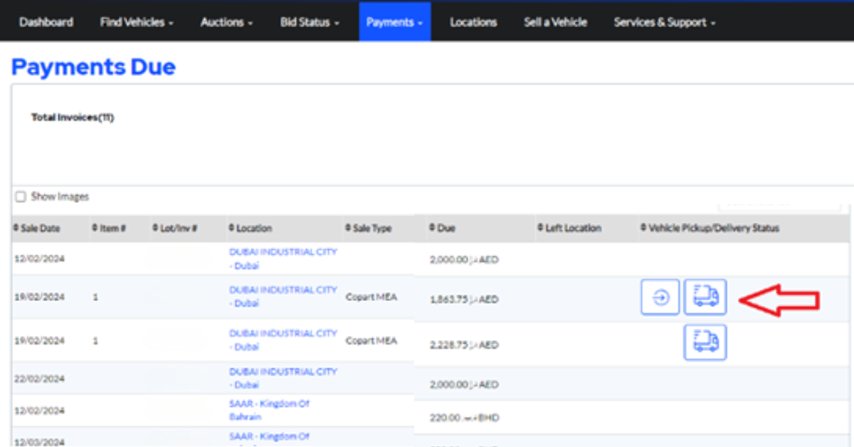 Members can also conveniently request vehicle delivery directly from their dashboard. Simply log in to your Copart member account, navigate to 'Payments Due,' and select the lot you wish to have delivered.